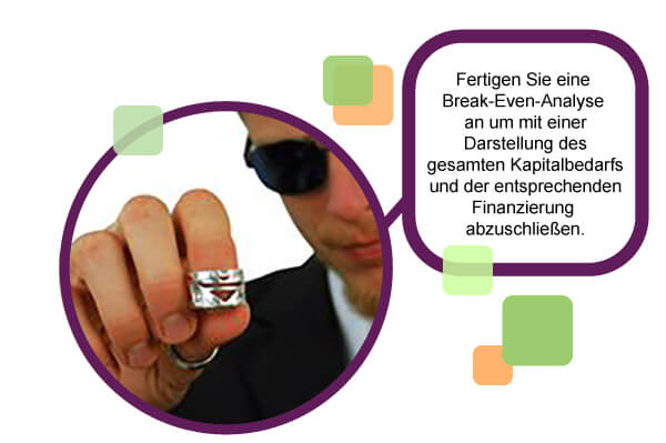 Beziehen Sie konkret Stellung zu Ihren Kalkulationsgrundlagen und Absatzprognosen. Welche Investitionen und Betriebsmittel sind erforderlich? Fertigen Sie eine Break-Even-Analyse an um mit einer Darstellung des gesamten Kapitalbedarfs und der entsprechenden Finanzierung abzuschließen.
